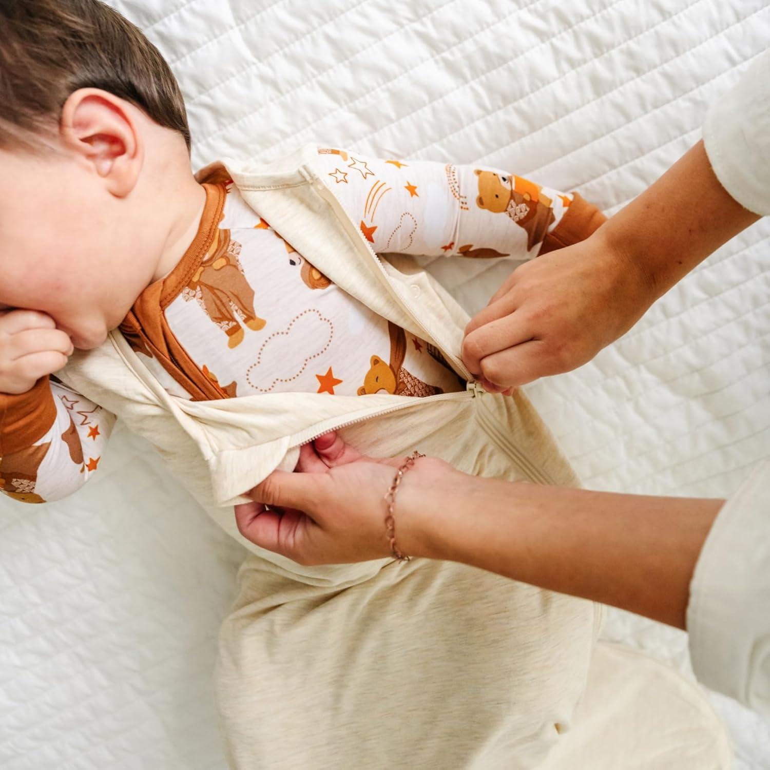 Give your little dreamer the gift of perfect sleep with our Seasonless Sleepy Bag! Made from ultra-soft, breathable Lunaluxe viscose from bamboo fabric, this 1.5 TOG baby sleep sack is designed to keep your baby cozy through the night. The hypoallergenic and eczema-friendly fabric makes it an ideal choice for newborn sleep sacks, infant sleep sacks 6-12 months, and toddler sleep sacks up to 24 months. Featuring clever adjustable under-arm snaps and a convenient double zipper system, this bamboo sleep sack offers both comfort and functionality. The internally quilted design provides just-right warmth for nursery temperatures 68°F-74°F, making it perfect for year-round snuggles. Whether it's naptime, bedtime, or those middle-of-the-night wake-ups, this wearable blanket makes every sleep moment magical. Available in sizes ranging from baby sleep sack 0-3 months to sleep sack 18-24 months, this sleepy bag truly grows with your little one. The fully encased zipper and seams protect delicate skin while meeting all safe sleep guidelines. It's also perfect for creating those precious matching moments with a coordinating Zippy! Say goodbye to loose blankets and hello to secure, snuggly sleep that lasts all night long