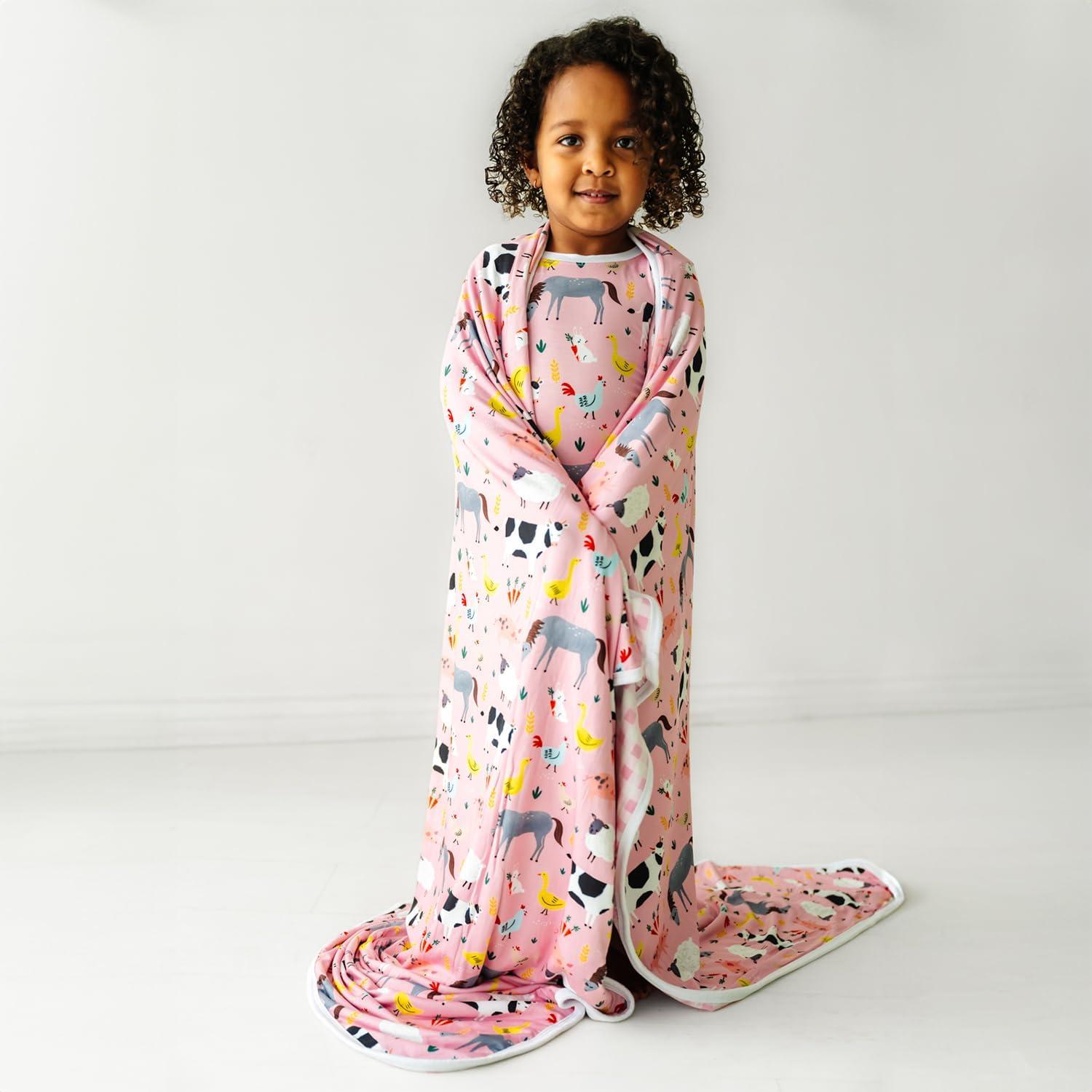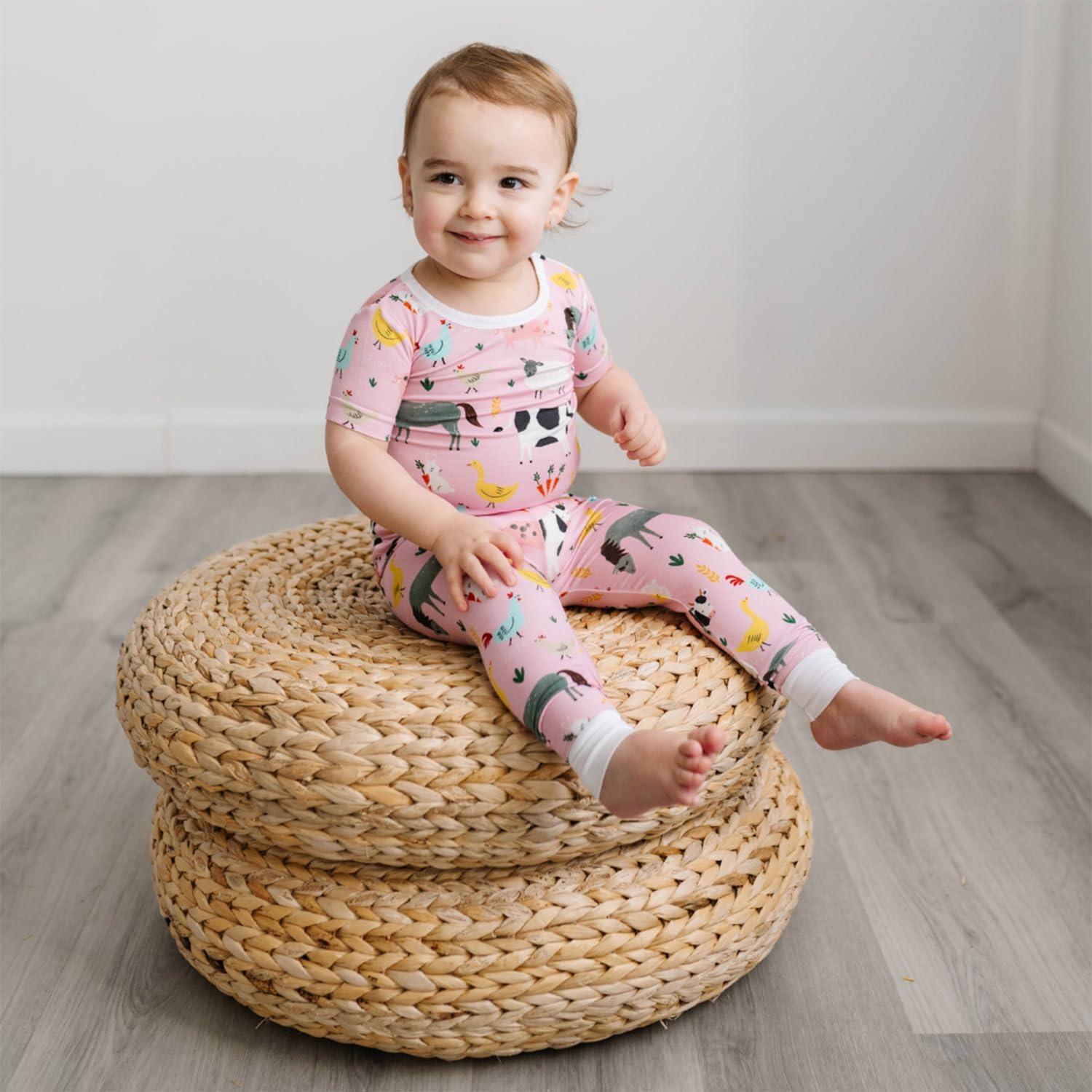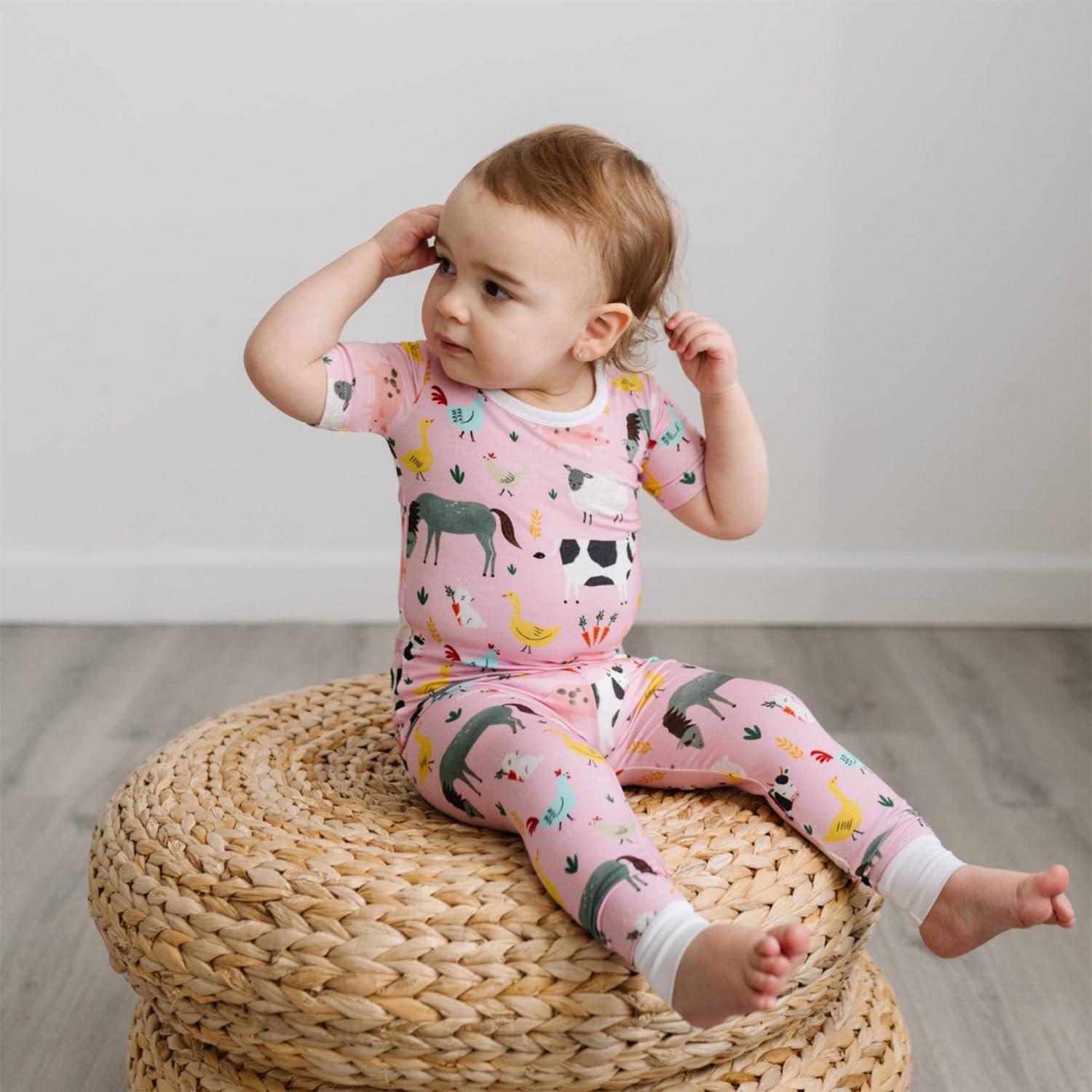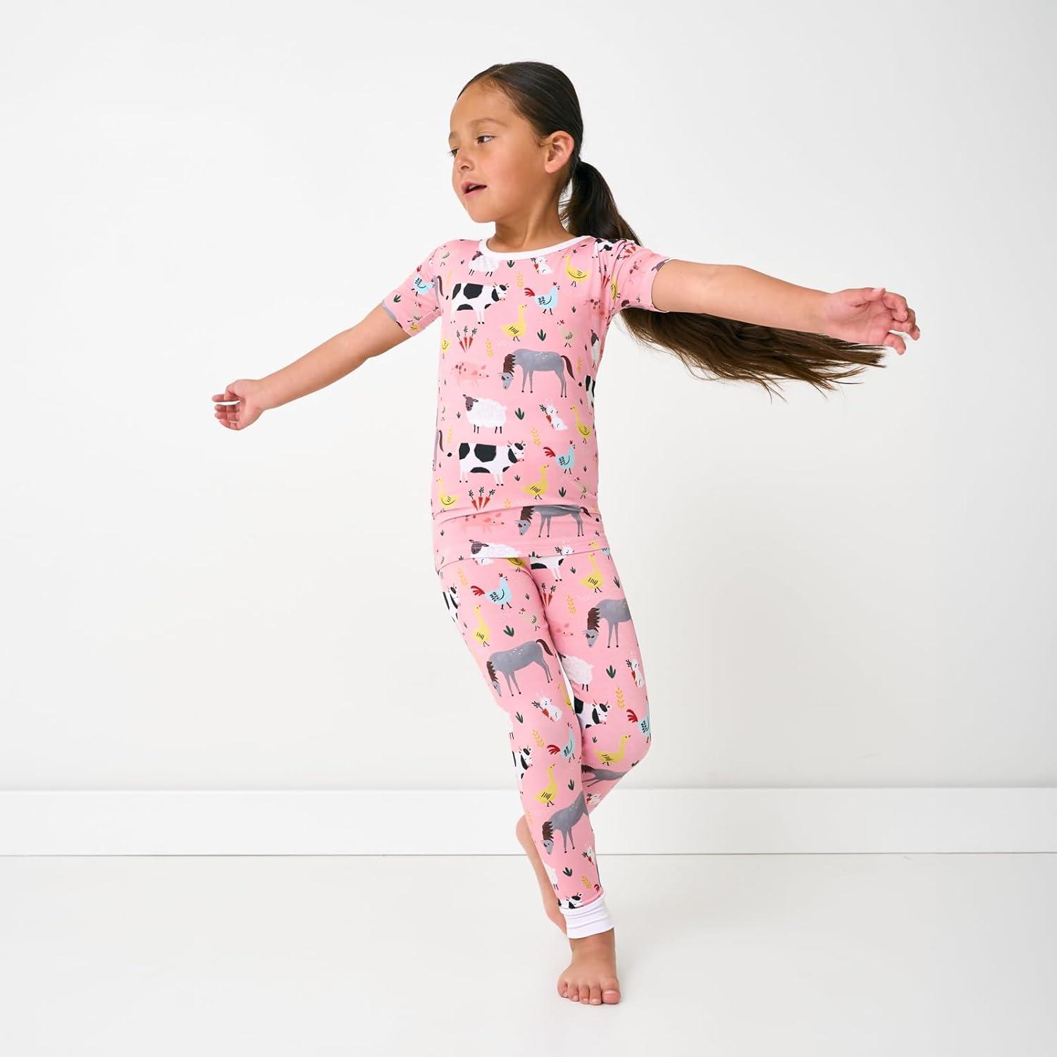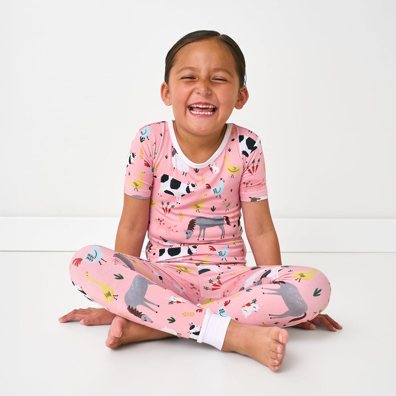 Little Sleepies Short Sleeve Shirt & Pants Pajama Set for Kids, Viscose Derived from Bamboo Toddler and Kids PJs(Pink Farm Animals)