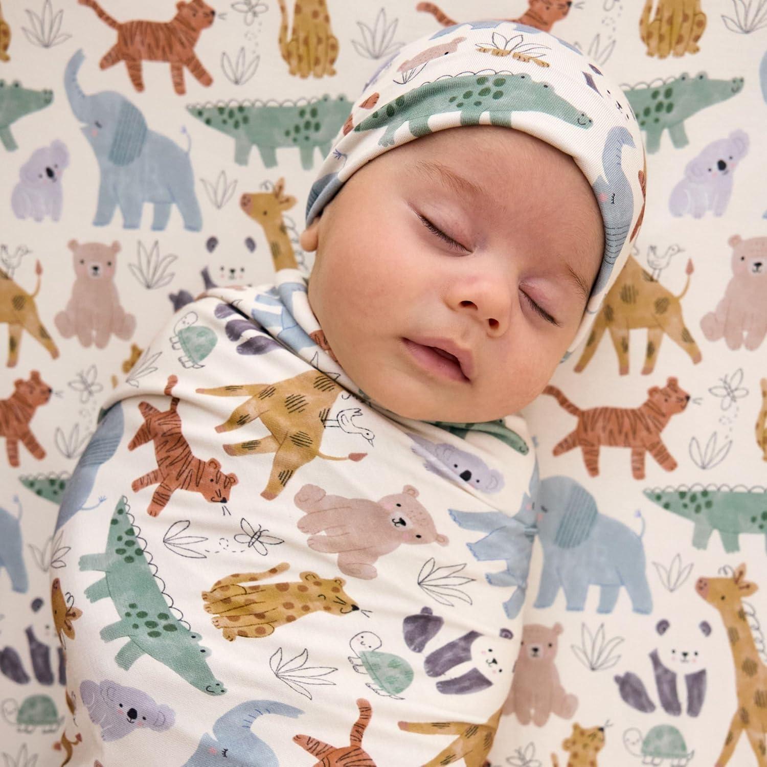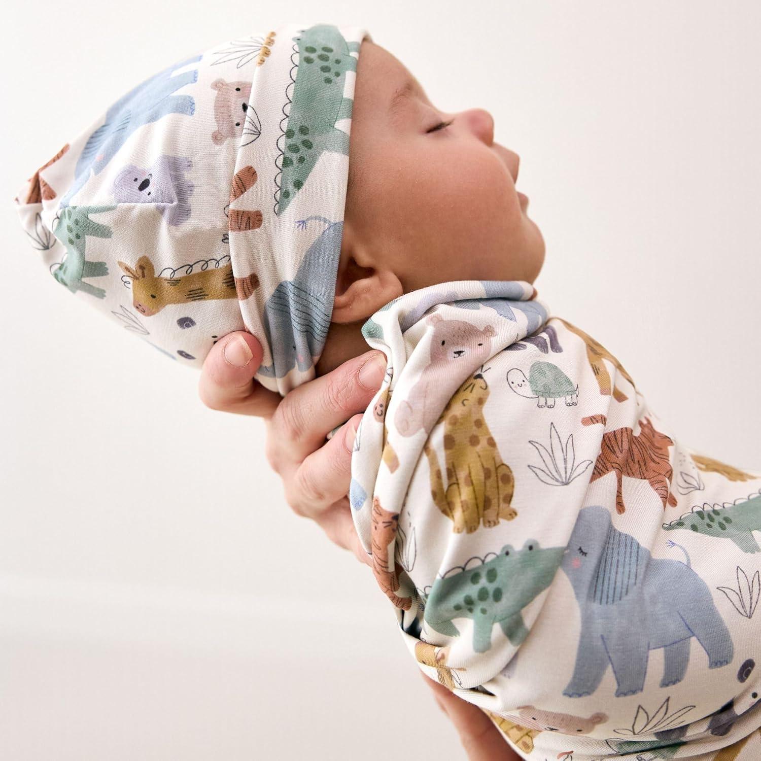 Little Sleepies Swaddle & Beanie Set, Viscose from Bamboo Baby Swaddle Blanket Wrap Unisex Newborn Hospital Outfit (Light Fog Ribbed)(Sweet Safari)