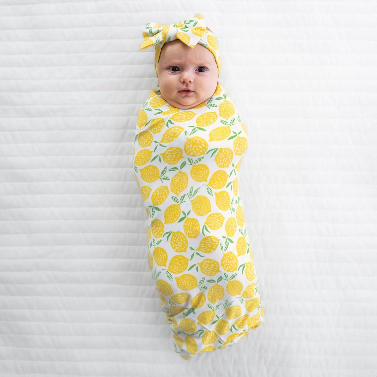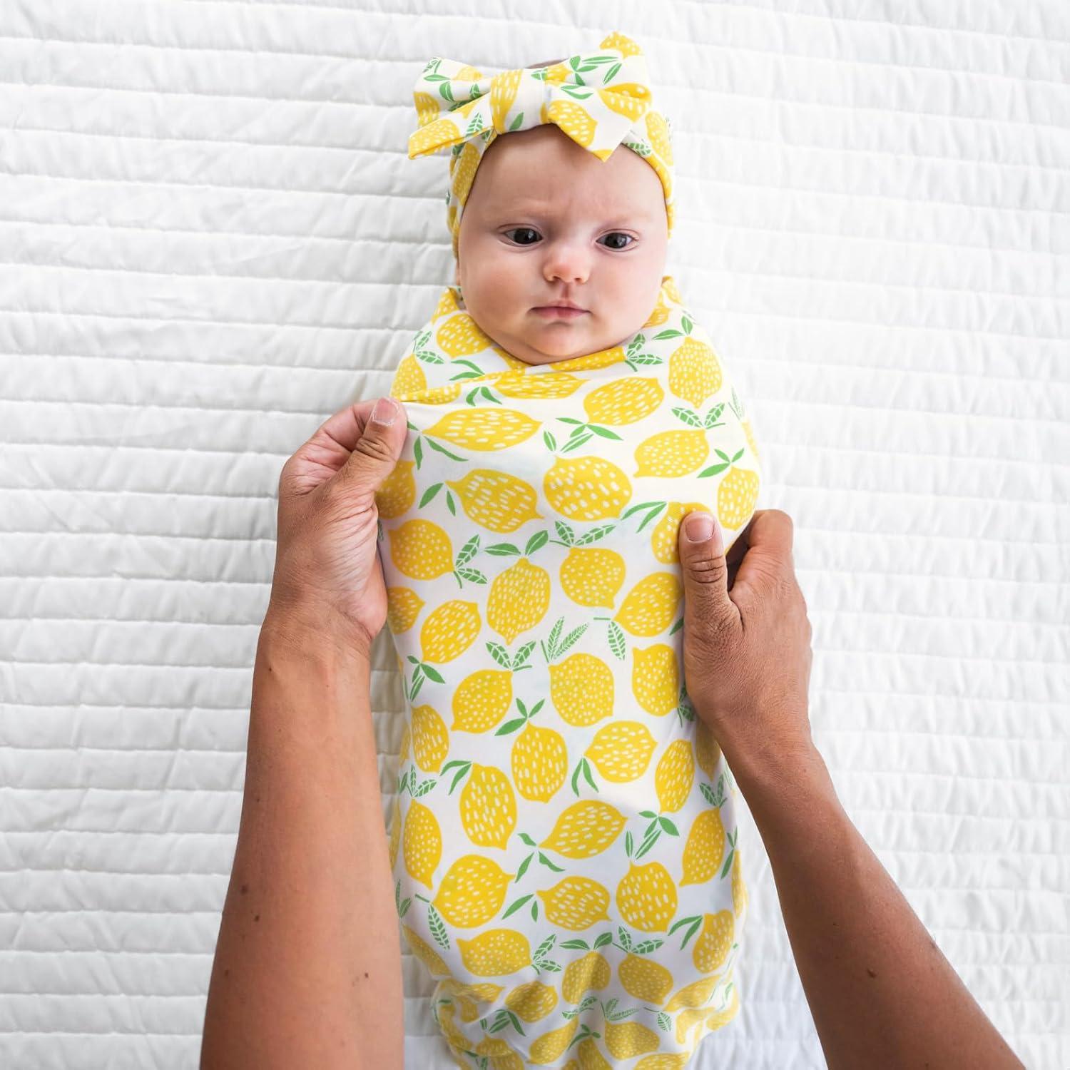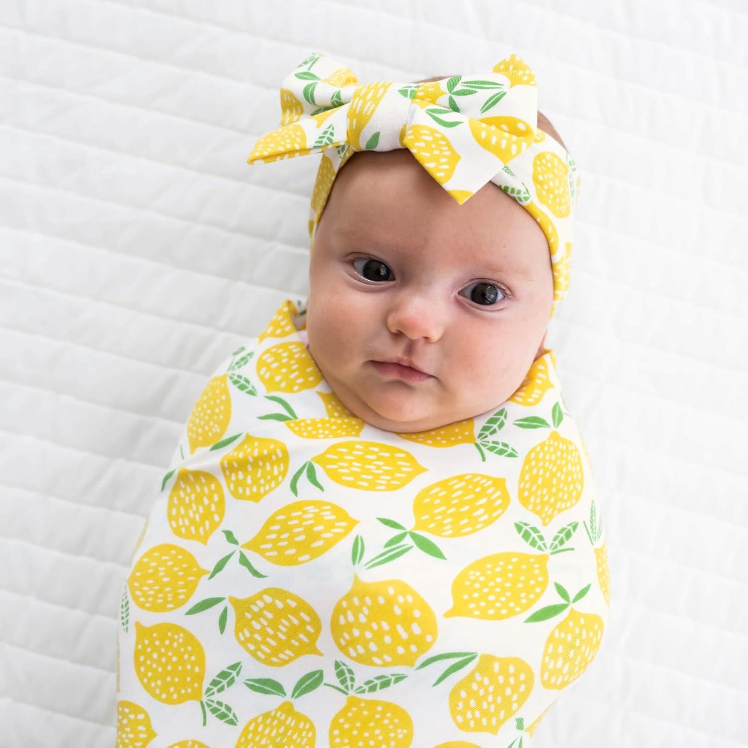Little Sleepies Swaddle & Headband Bow Set, Viscose from Bamboo Baby Swaddles, Newborn Baby Girl Clothes (Luxe Modern & Merry)(Lemons)