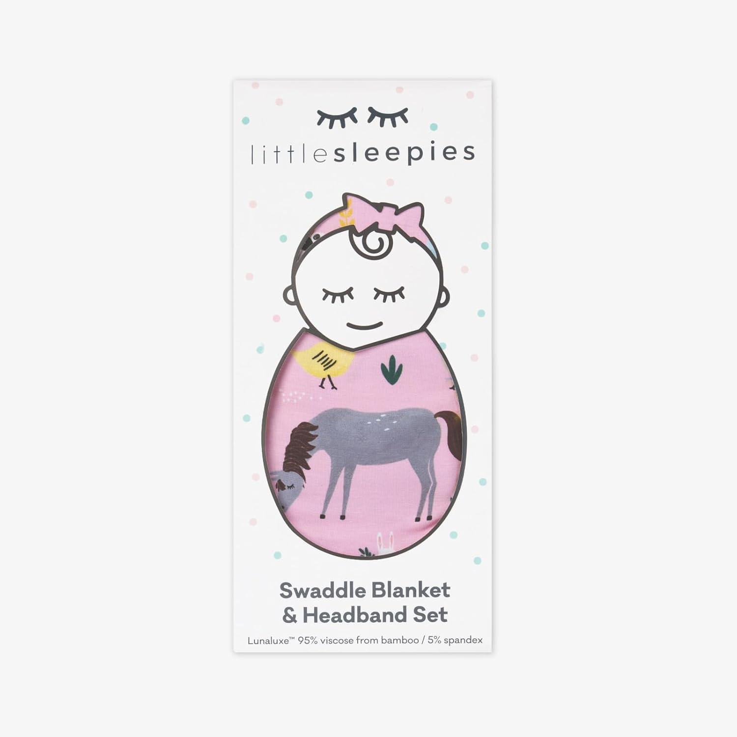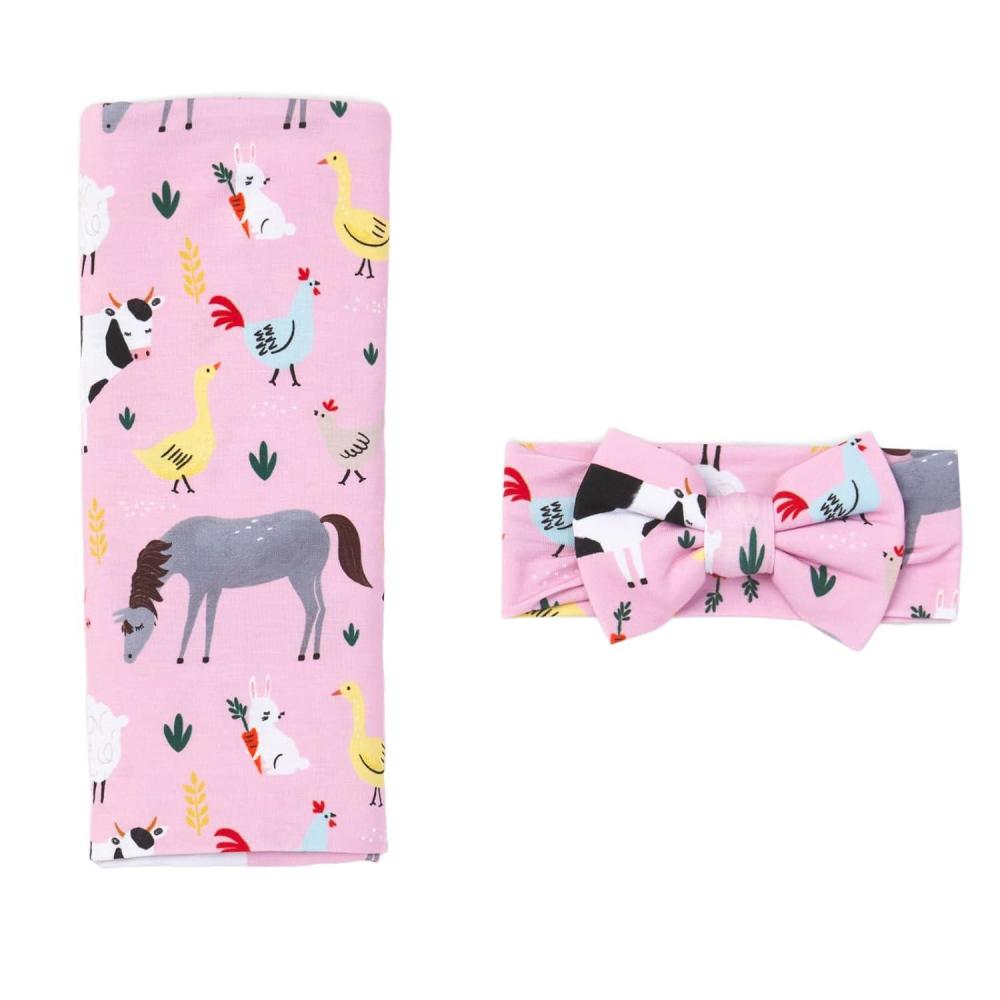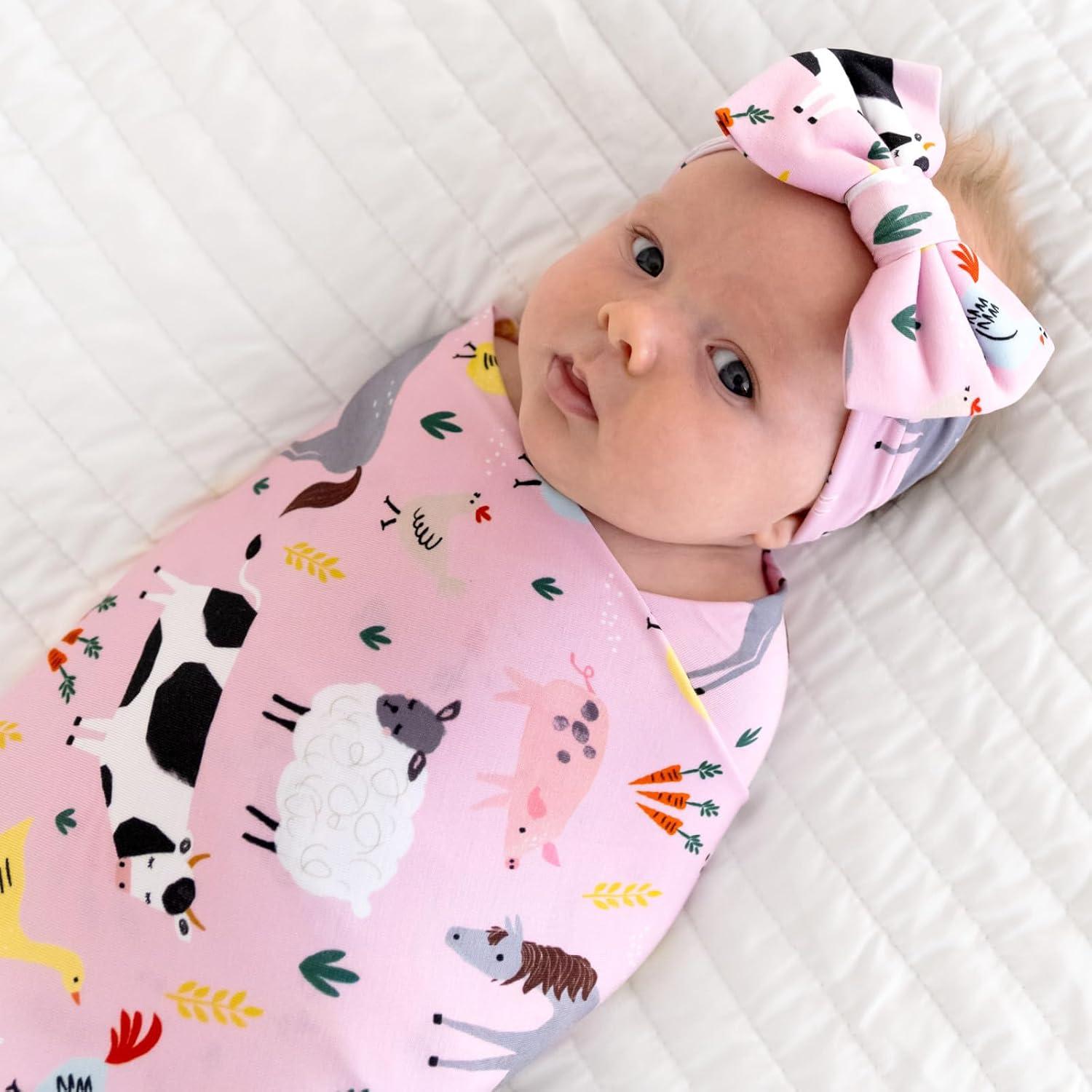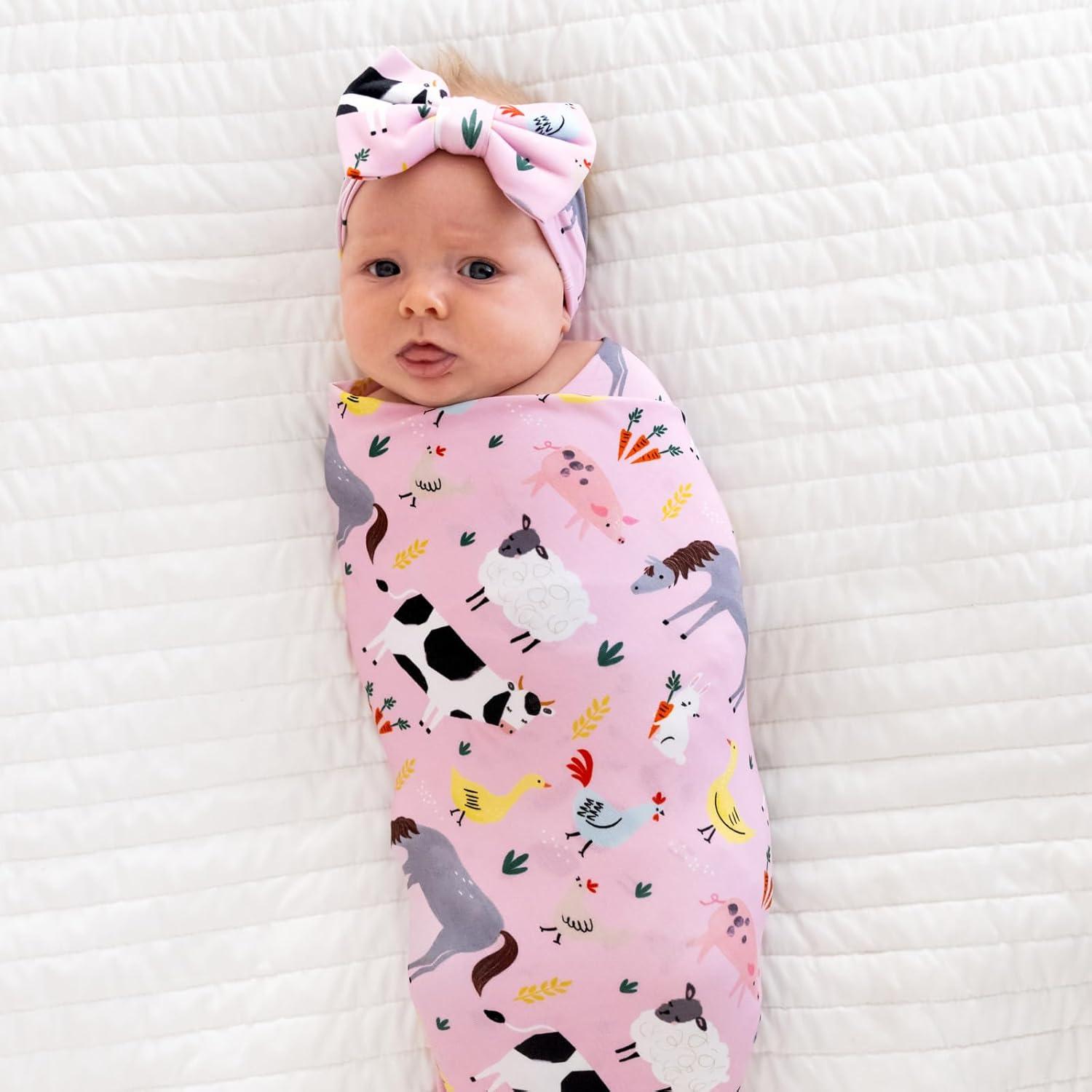 Little Sleepies Swaddle & Headband Bow Set, Viscose from Bamboo Baby Swaddles, Newborn Baby Girl Clothes (Luxe Modern & Merry)(Luxe Pink Farm Animals)