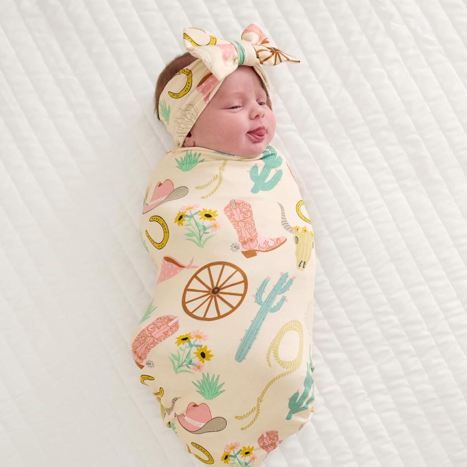 Little Sleepies Swaddle & Headband Bow Set, Viscose from Bamboo Baby Swaddles, Newborn Baby Girl Clothes (Luxe Modern & Merry)(Pink Ready to Rodeo)